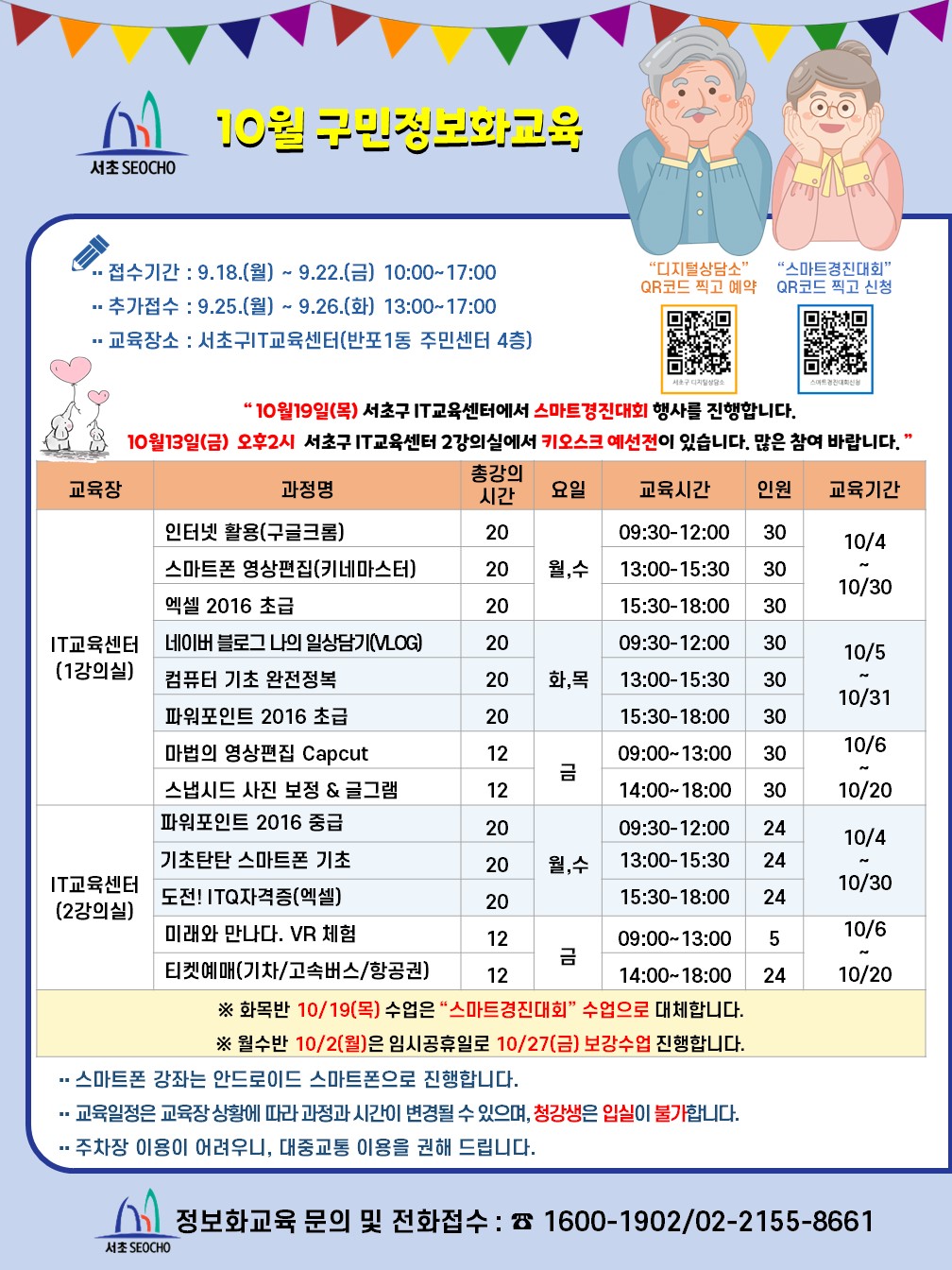한컴캠퍼스가 운영하고 있는 서초구 어르신정보화교육 2023년 10월 교육 일정입니다.